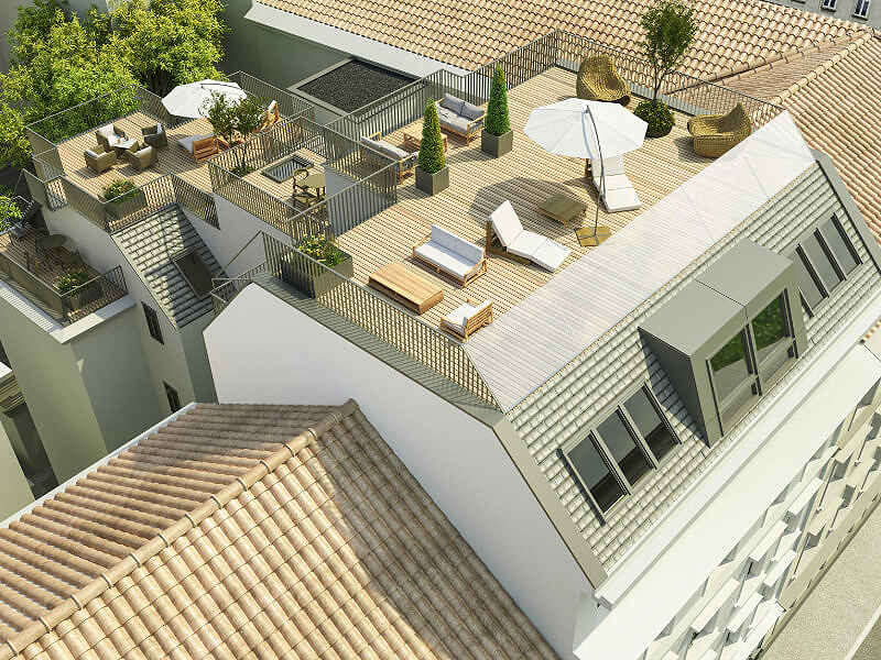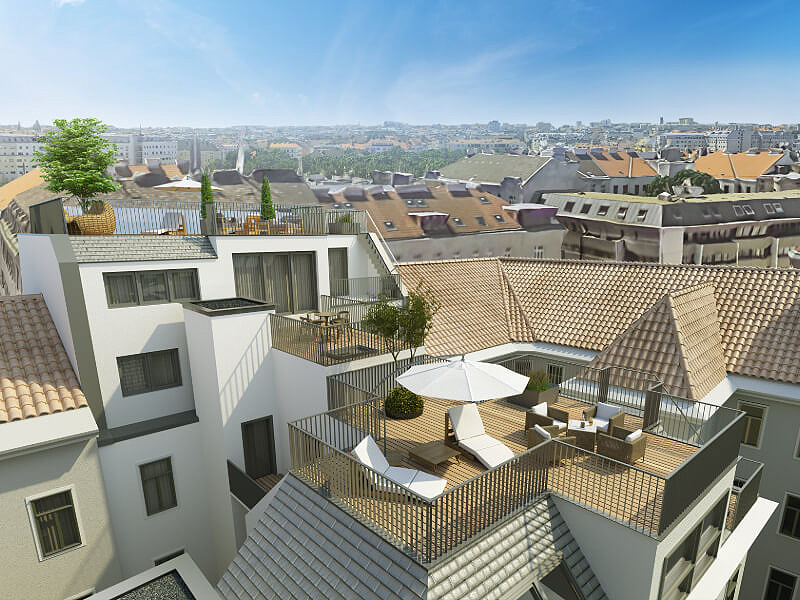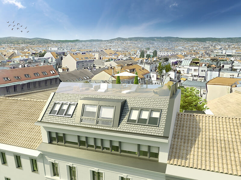 Die hierbei errichteten Wohn- und Nutzflächen können durch ein erkennbares Auge für die wichtigen Details überzeugen. So entsteht durch die Glasbarriere auf der Dachterrasse, welche die Schräge des Dachstuhls aufnimmt und verlängert, der Eindruck uneingeschränkter Freiheit über den Dächern der Stadt. Die im Innenhof neu angelegten Balkon und Terrassenflächen hingegen schenken ein Gefühl der Zurückgezogenheit und entspannten Privatsphäre. Die mit wunderschönen Fensteraufbauten geschmückte Außenfassade wurde durch die Renovierungsarbeiten ebenfalls der Glanz alter Tage zurückgegeben und durch einen neu errichteten Liftschacht wurde das Gesamtpaket elegant abgerundet.