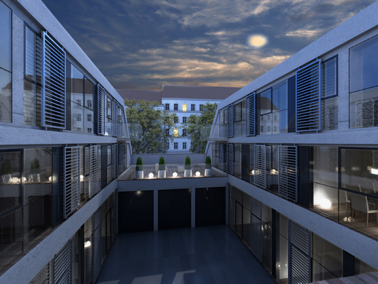 Durch die Süd-Östliche Öffnungsrichtung des Hofes dringen bereits am Morgen die ersten Sonnenstrahlen in die Wohnungen des sechsstöckigen Gebäudes. Dieser ausgezeichneten Lage wurde bei den Planungsarbeiten ein hoher Stellenwert zugewiesen und jede Wohnung mit Innenhof-seitigem Balkon ausgestattet um das Meiste aus den exzellenten Rahmenbedingungen heraus zu holen.