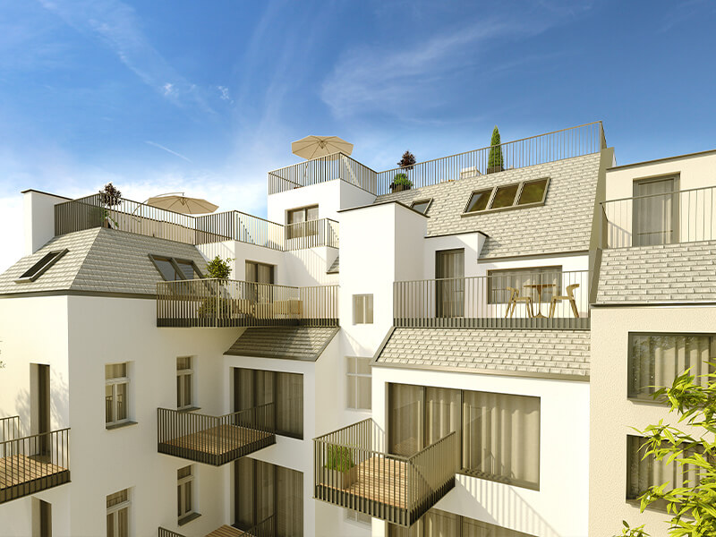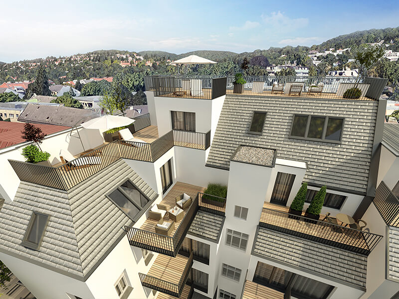 Nicht nur der geschwungene Glaskörper, welcher die Penthouse Wohnung beherbergt, lässt einen wunderbaren Blick über die Weiten des Wienerwalds zu, sondern auch die zahlreichen Terrassen- und Balkonflächen erlauben es den zukünftigen Bewohnern die Vorzüge des Wohnens im Grünen zu genießen. Hier verschmelzen elegant die Annehmlichkeiten des Lebens in der Stadt mit den nahen Erholungsmöglichkeiten, die ein Waldgebiet mit sich bringt.