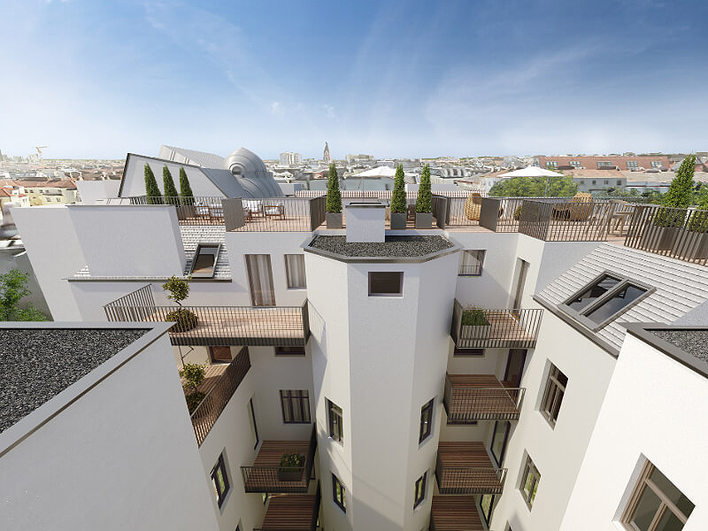Ebenso kennzeichnend sind die sorgfältig ausgewählten Gestaltungsmittel und die hochwertigen Materialen, die eine optimale Raumnutzung gewährleisten und zu einem Tanz der großbürgerlichen Vergangenheit mit der urbanen Moderne einladen. Durch die zahlreichen erhaltenen und neu errichteten Freiflächen wird zusätzlicher Raum geschaffen und das Lebensgefühl, welches durch die Kombination aus urbaner Zentrumsnähe und grüner Privatsphäre geprägt ist, stark unterstrichen.