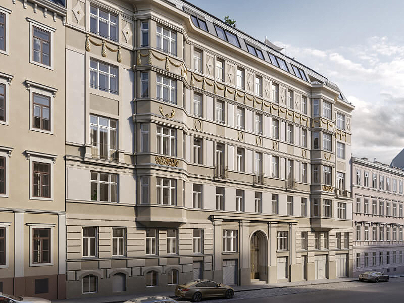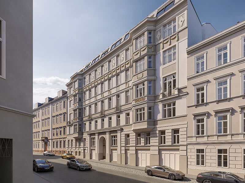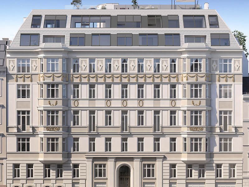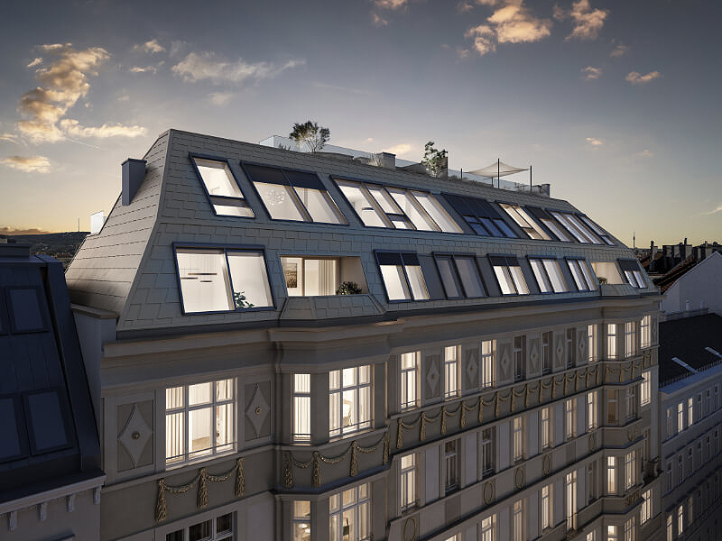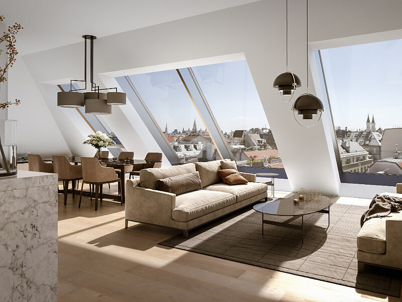 Um konstruktiven Wohnraum in dem dicht besiedelten Gebiet zu erschaffen wurde außerdem das Dachgeschoss erweitert und mit anregenden Penthouse Wohnungen ausgestattet. Hier wurde ganz besonders auf viel warmes Licht wert gelegt, welches durch die großflächige Glasdecke die gesamte Wohnung in einen goldenen Glanz taucht. Die stilvolle Aufteilung des oberen Stockwerks erlaubt es den Bewohnern einen atemberaubenden Rundumblick über Wien in seinem schönsten Gewand zu genießen.